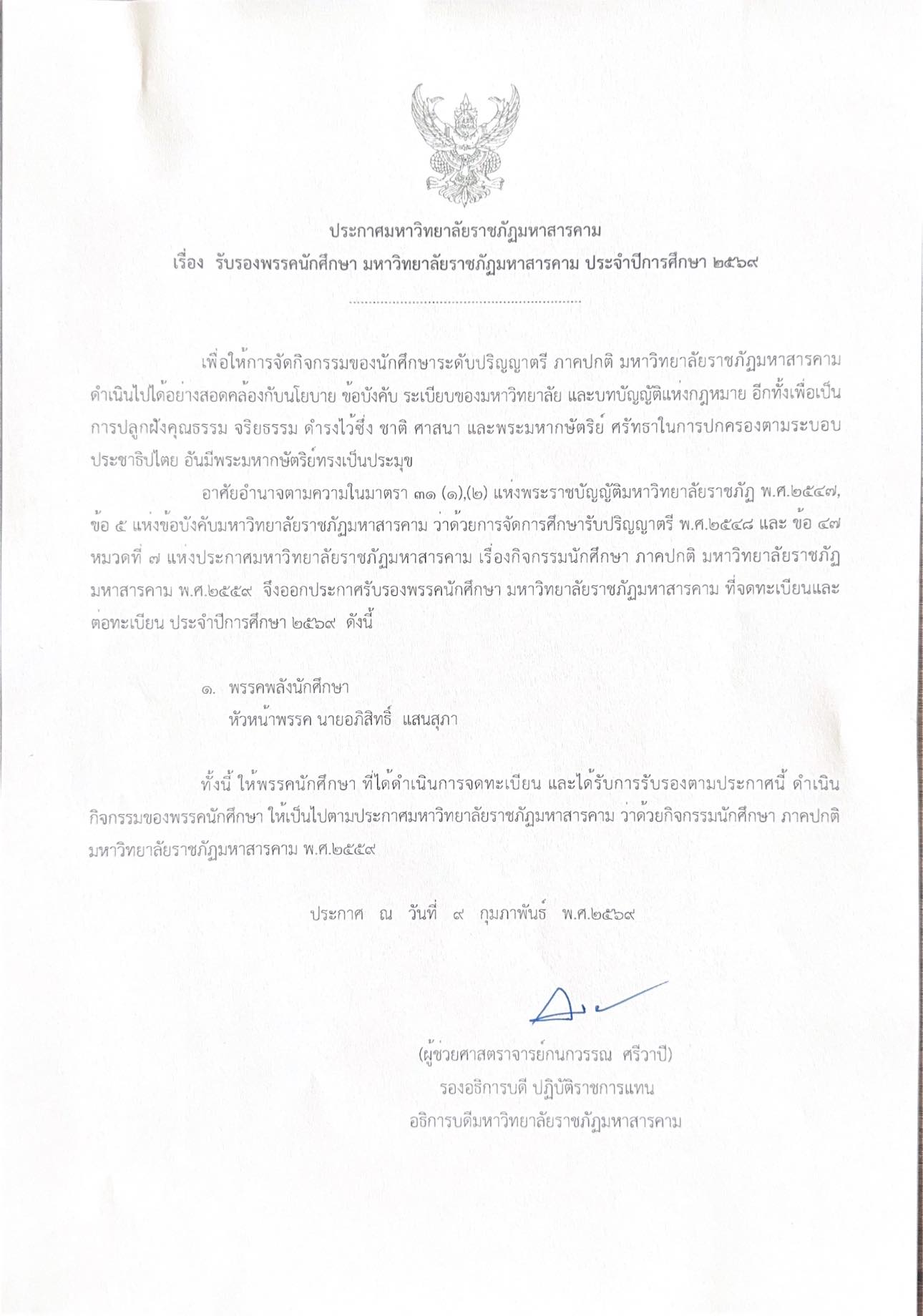 เรื่อง : รับรองพรรคนักศึกษา มหาวิทยาลัยราชภัฏมหาสารคาม ประจำปีการศึกษา 2569