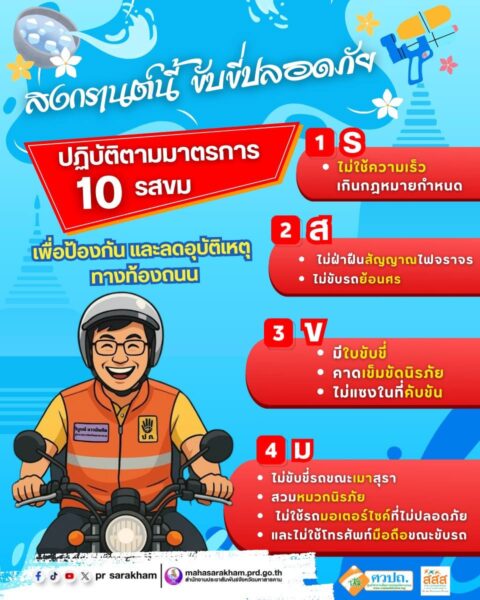 สงกรานต์นี้ ขับขี่ปลอดภัย ปฏิบัติตามมาตรการ 10 รสขม เพื่อป้องกัน และลดอุบัติเหตุทางท้องถนน ด้วยความปรารถนาดีจาก กองพัฒนานักศึกษา มหาวิทยาลัยราชภัฏมหาสารคาม